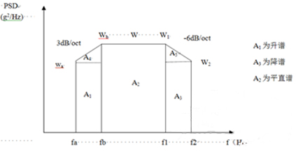 為了簡便起見,往往將功率譜密度曲線圖劃分成若干矩形和三角形,并利用上升斜率(如3dB/oct)和下降斜率(如-6dB/oct)分別算出wa 和w2,然后求各個幾何形狀的面積與面積和,再開方求出加速度總均方根值。
